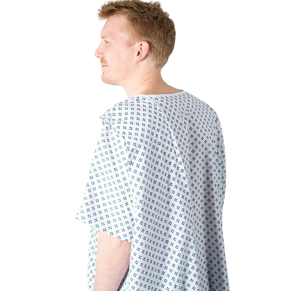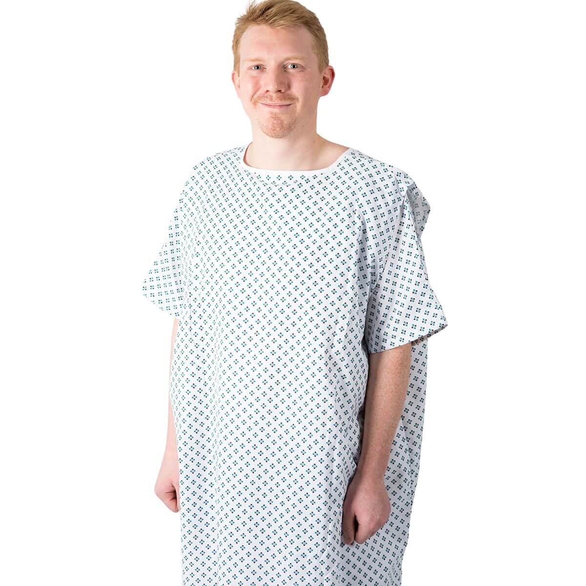 This innovative toga-style gown features a third sleeve that wraps over the body, providing superior coverage and eliminating the need for fiddly fasteners—ideal for enhancing patient dignity during stays or procedures. Our comfortable hospital gowns are designed with patients in mind. This gown is available in one size, a standard large, which is designed to fit most adults.