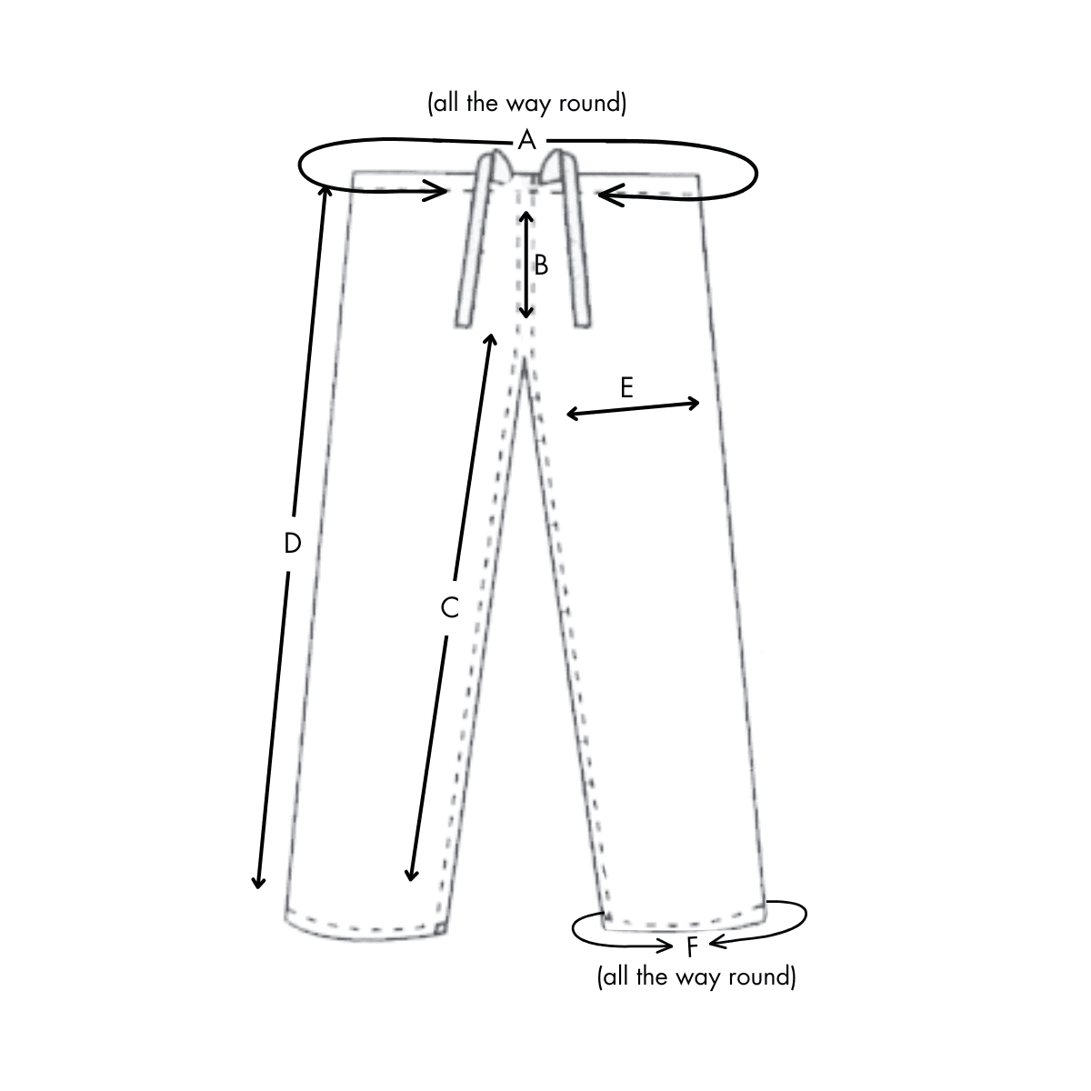 | A: Waist Circumference (cm) | B: Front rise (cm) | C: Inside Leg Length (cm) | D: Waist to Ankle Length (cm) | E: Thigh width (cm) | F: Cuff circumference (cm) | |